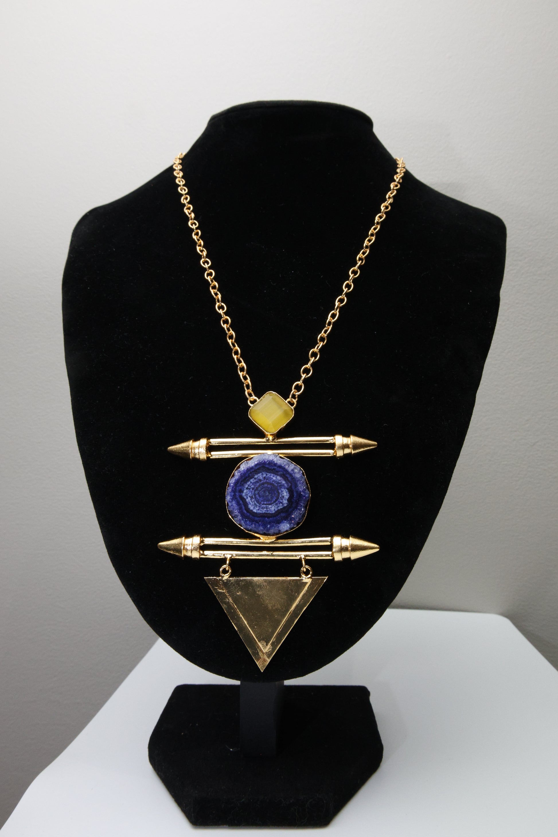 Make a bold statement with the Blue Solar Quartz Statement Necklace. This unique piece features a genuine solar quartz geode slice, showcasing a vibrant blue-purple color and sparkling crystal center. The stunning quartz gemstone is beautifully accented by a modern geometric design, featuring gold-toned spikes and a triangular charm. The entire pendant hangs from a delicate gold chain, making this an eye-catching and artistic addition to any jewelry collection. This necklace is a perfect blend of modern design and natural beauty.