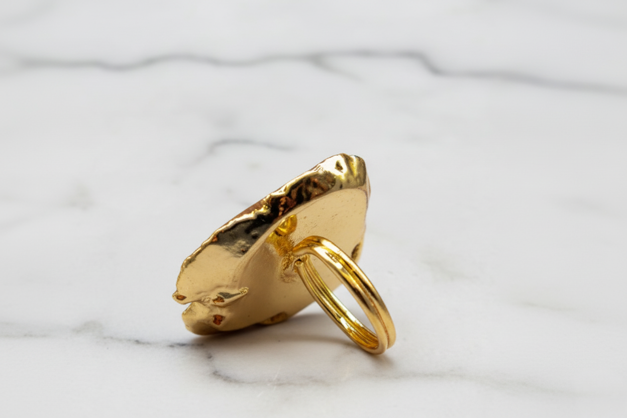 This ring is made from brown agate, which is a very pretty stone. It's finished with lustrous 24k gold plating. People worked really well to make it. This agate jewelry is lovely for wearing yourself or giving to someone as a special gift because it shows the beauty of nature in a pretty way.