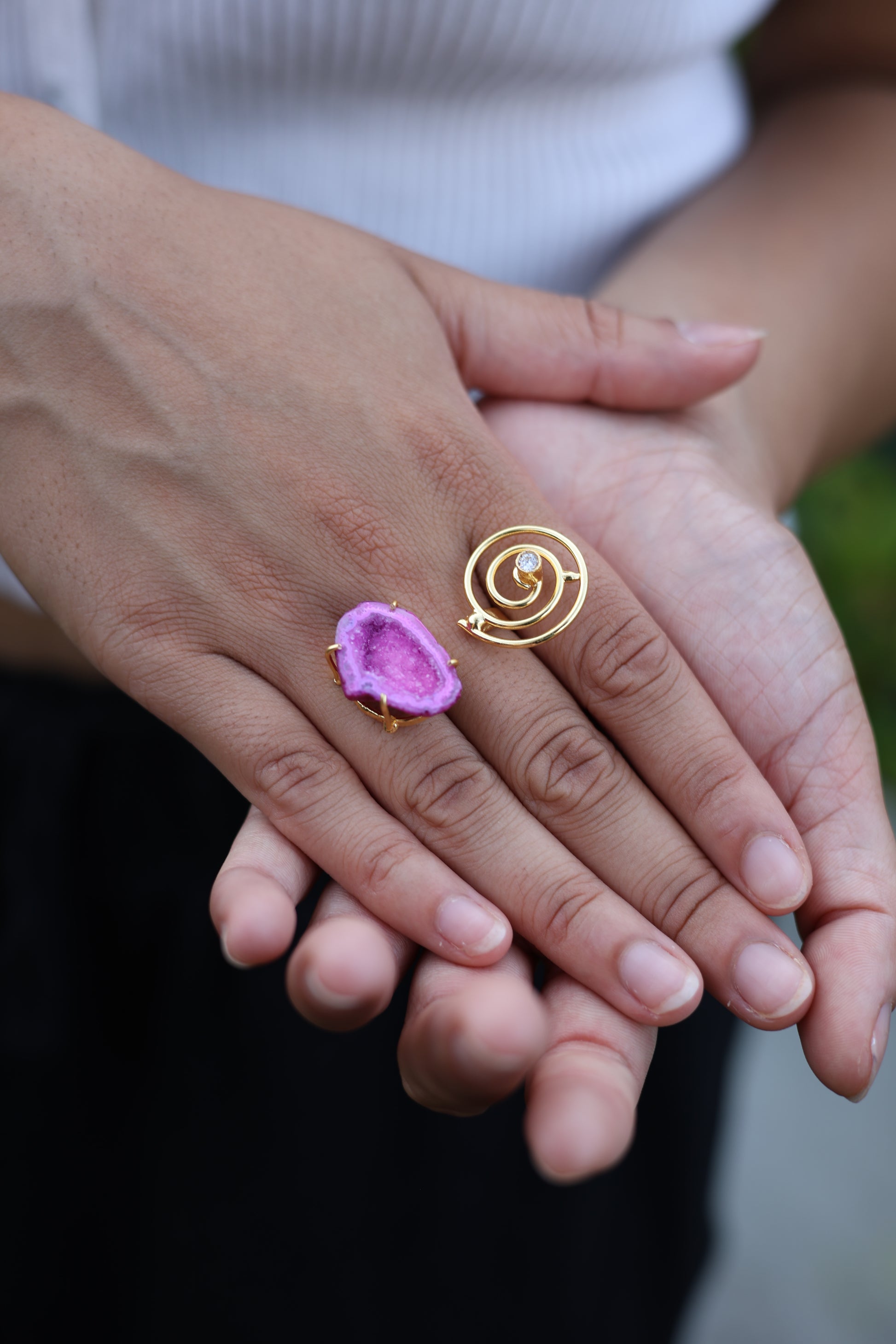 Elevate your vibrant style with the Cosmic Purple Geode Ring. This stunning piece features a genuine raw geode gemstone with a captivating purple crystal cluster. The unique, one-of-a-kind stone is expertly set in a delicate, handcrafted gold-tone spiral setting, creating a modern and artistic piece of jewelry. Perfect for a special occasion or to add a pop of color to your everyday look, this geode ring is a must-have for those who appreciate natural beauty and bold design. Each ring is as unique as the cosmos itself, making it a truly special addition to your jewelry collection.