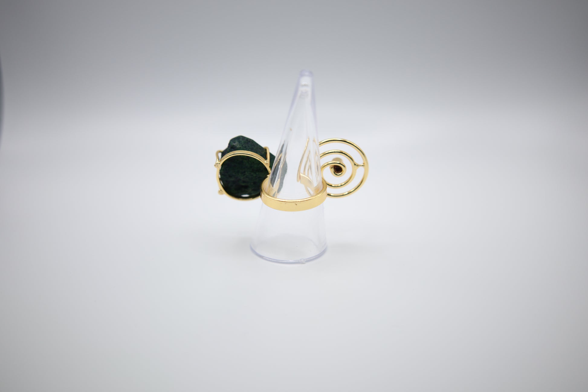 Discover the natural beauty of the Emerald Geode Ring. This stunning piece features a genuine raw geode gemstone with a captivating green crystal cluster that sparkles like a hidden treasure. The unique, one-of-a-kind stone is expertly set in a delicate, handcrafted gold-tone spiral setting, creating a modern and artistic piece of jewelry. Perfect for adding a pop of color to your everyday look or a unique touch for a special occasion, this geode statement ring is a must-have for those who appreciate natural beauty and bold design. Each ring is a unique testament to nature's artistry, making it a truly enchanting and unforgettable piece.