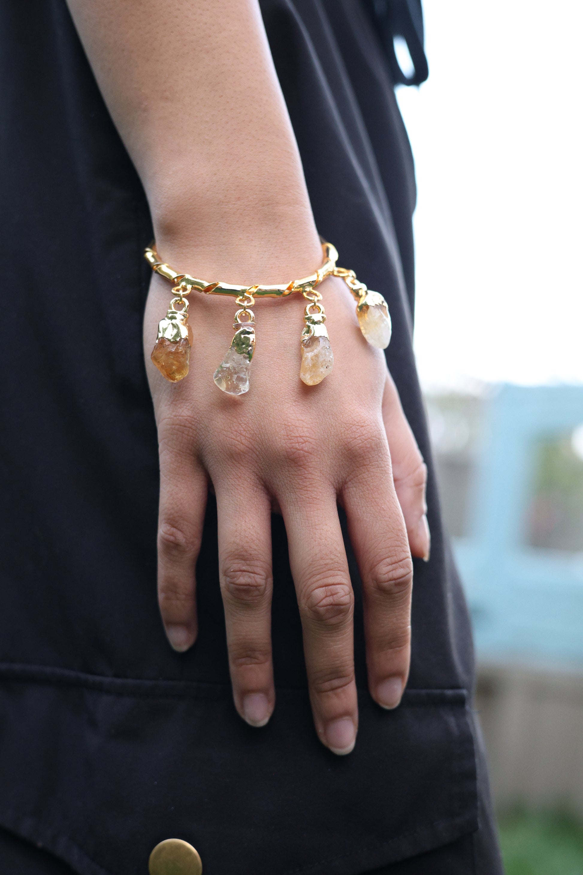 Find your radiant energy with the Golden Sunshine Dangle Bracelet. This unique charm bracelet features multiple small, irregular pieces of raw Citrine, known as the stone of sunshine and abundance. The uncut gemstones are set in simple gold-tone prongs, hanging delicately from a sleek, twisted gold-tone bangle. This charming Citrine bracelet is a perfect blend of Bohemian style and positive energy, making it an ideal raw stone jewelry piece for layering or wearing solo.