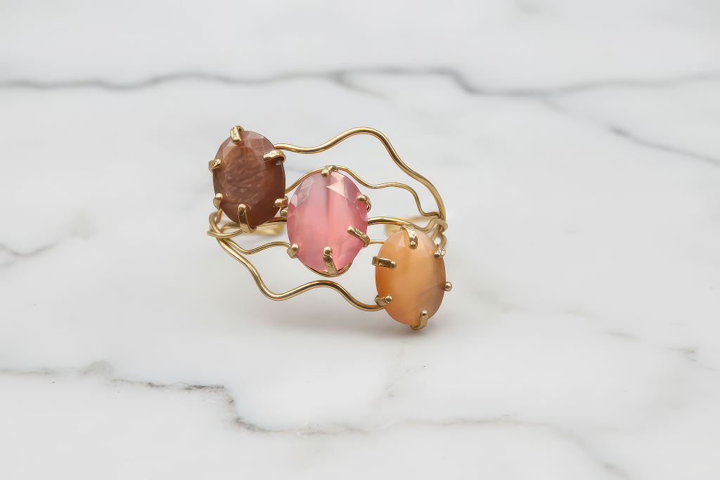 This exquisite bracelet features three Cat’s Eye stones in beautiful shades of pink, peach, and brown, each stone delicately reflecting a unique, captivating glow. The stones are framed in a sleek gold-plated design, adding a touch of luxury to their mesmerizing effect. The soft, wave-like gold accents bring sophistication to this already radiant piece.
