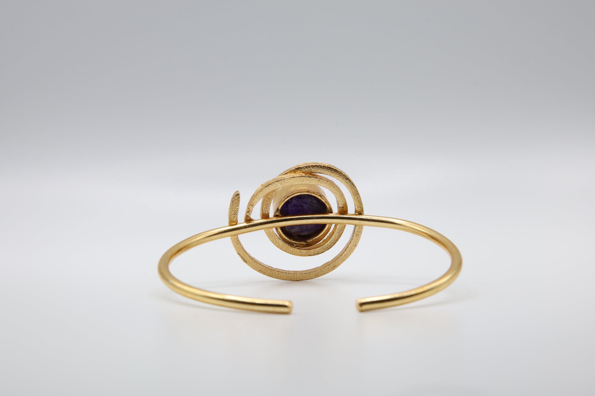 Discover the serenity of the Mystic Amethyst Bracelet, a truly unique raw gemstone bracelet. This handcrafted piece features a beautiful amethyst crystal, celebrated for its stunning deep purple color and calming energy. The natural stone is elegantly set in a striking gold-tone spiral design, creating an artistic and modern statement bangle. This one-of-a-kind amethyst bracelet is a perfect blend of organic beauty and elegant design, making it a meaningful addition to your jewelry collection.