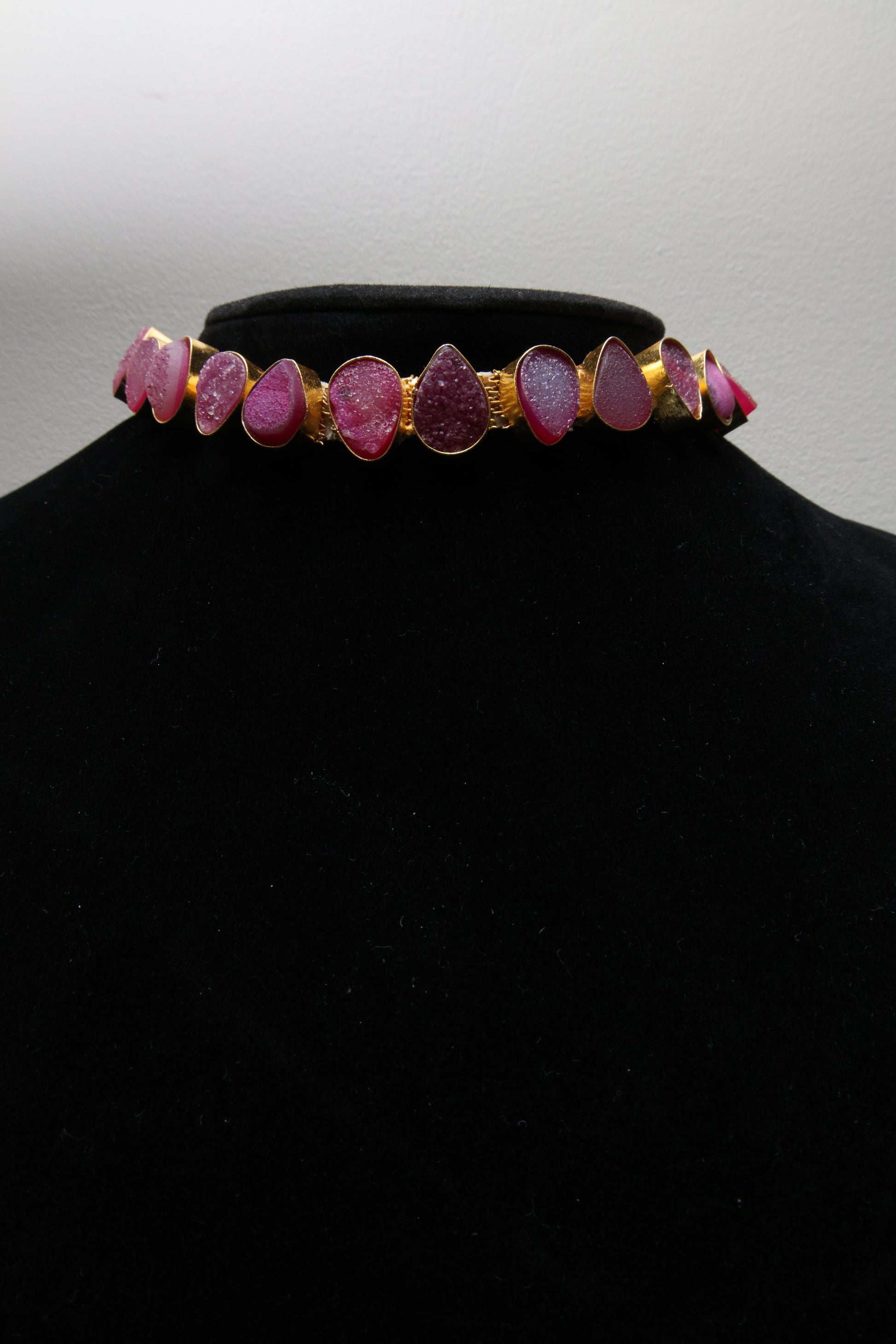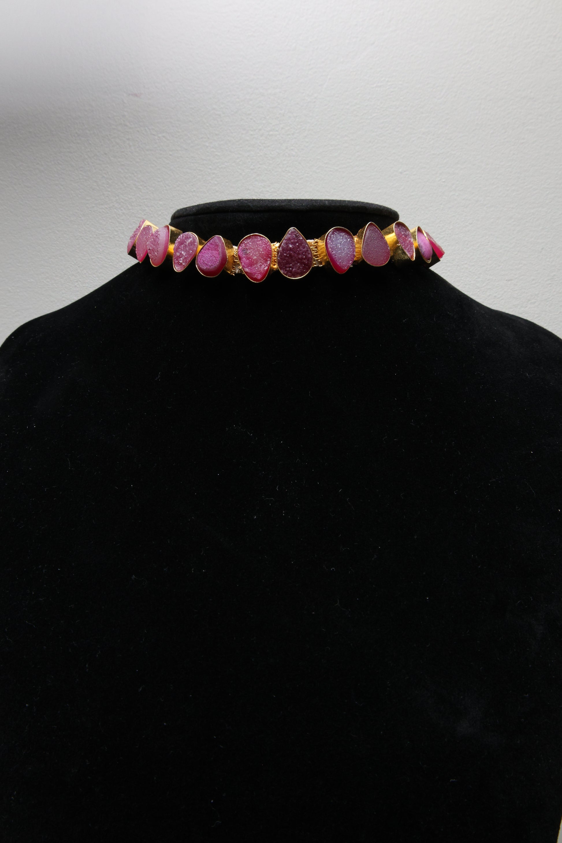 Discover the magical beauty of the Starlight Sugar Druzy Necklace. This unique raw gemstone choker features a collection of genuine, teardrop-shaped agate druzy stones with a beautiful, sparkling purple pinkish texture. The natural crystals are hand-selected for their vibrant pink color and arranged to create a bold, artistic design. This one-of-a-kind druzy necklace is a perfect blend of natural wonder and elegant style, making it a beautiful and memorable addition to your jewelry collection.