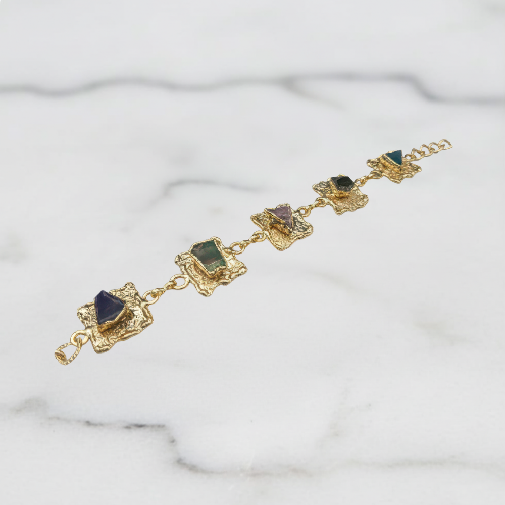 This Gold Bracelet is a handcrafted masterpiece that has been meticulously plated in 24k gold. The really exciting part is that it is made with four different natural striped Agate stones!