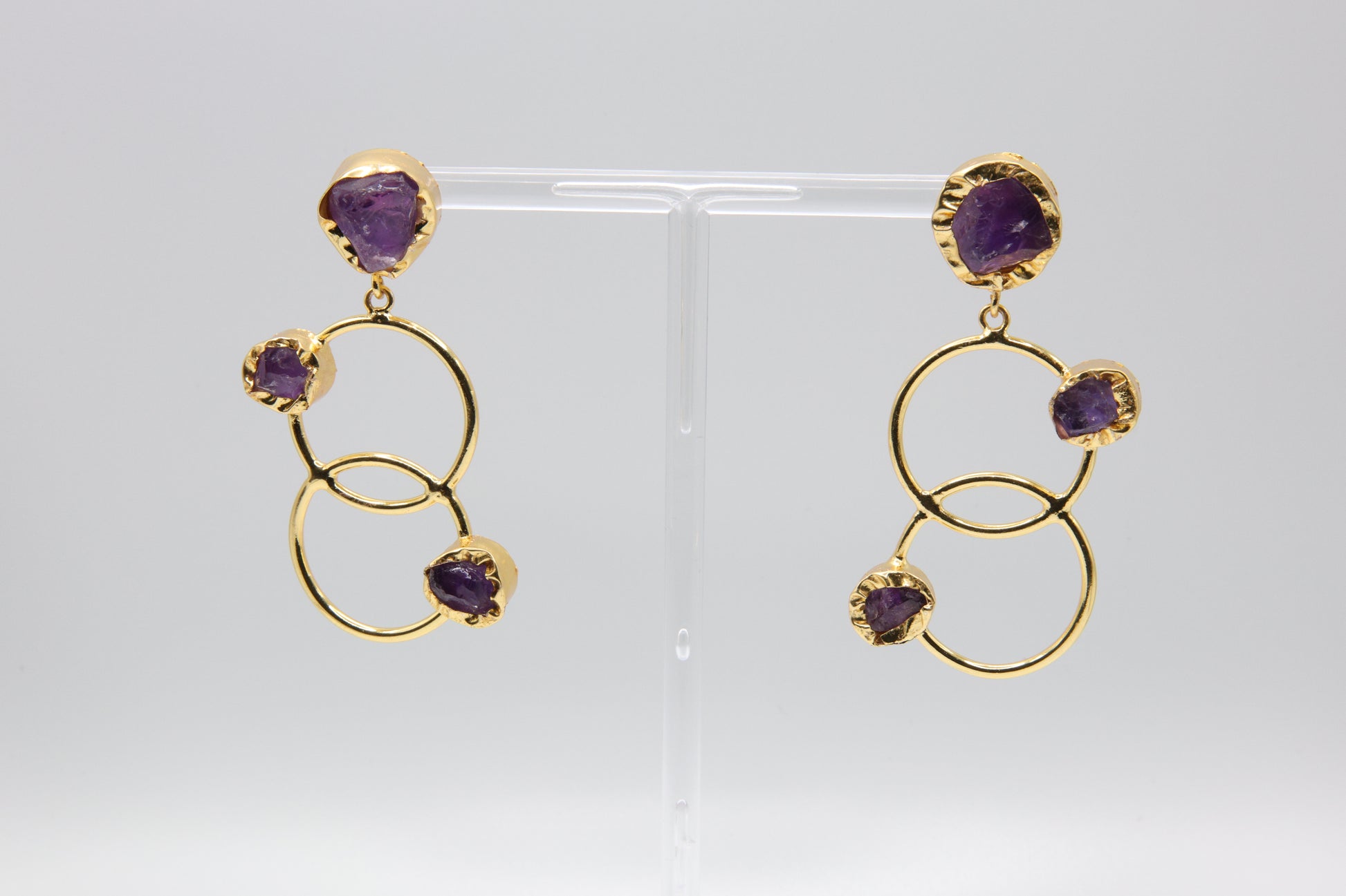 Find your artistic edge with the Violet Gemstone Link Earrings. This striking pair of raw amethyst earrings features three chunky, purple amethyst crystals set within an artistic, interlocking gold-tone hoop design. The natural gemstones are deliberately left uncut, adding a unique, earthy texture that contrasts beautifully with the polished metal. This one-of-a-kind amethyst statement jewelry is a perfect blend of natural power and modern geometric design, making it a captivating and memorable addition to your jewelry collection.